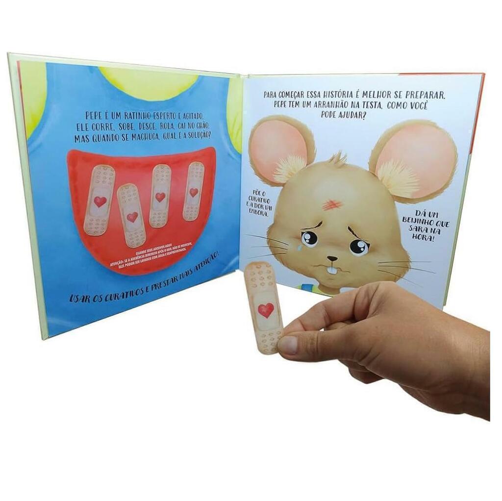 Mas aí vem a solução: Colocar um curativo e prestar mais atenção. Neste livro, as crianças se divertem colando adesivos de curativos nas ilustrações e cuidando dos machucados do ratinho.
