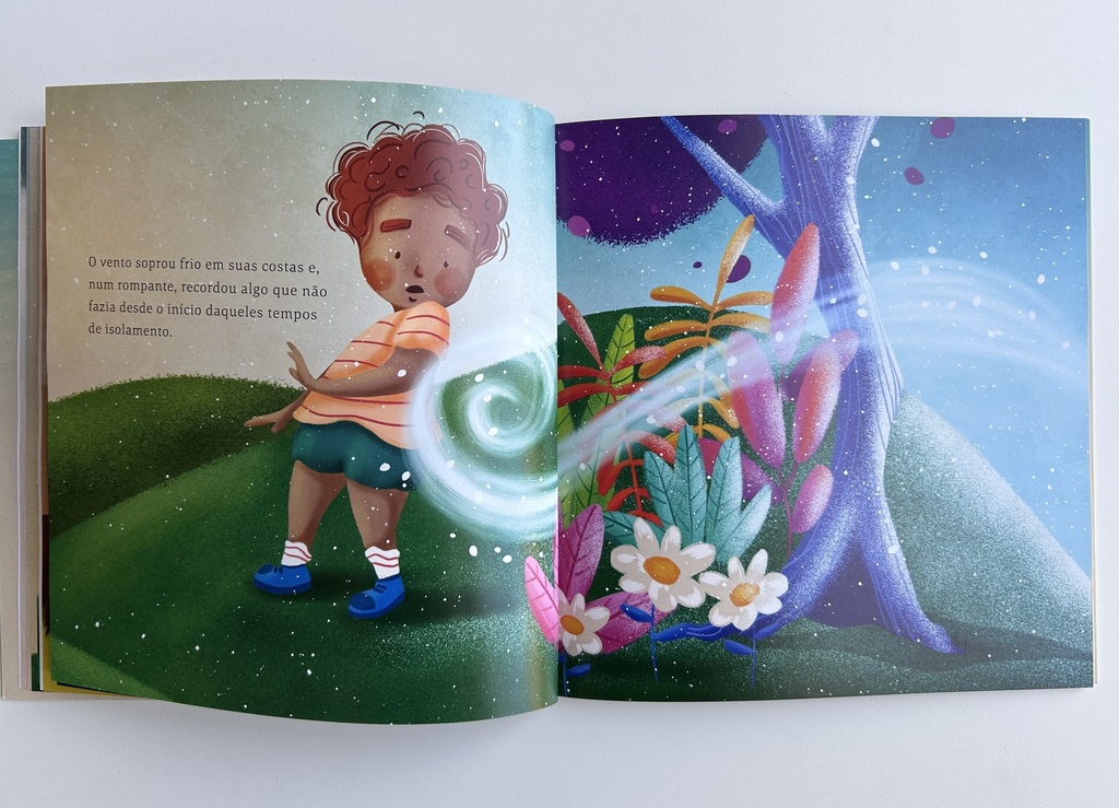 As ilustrações de Carolina Porto dão ares de sonho para cada viagem da imaginação do encantador protagonista da história.