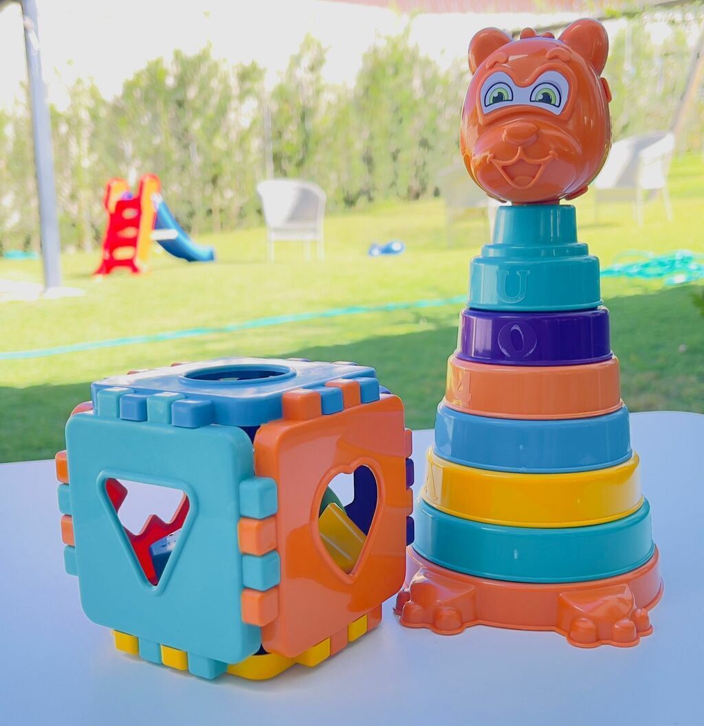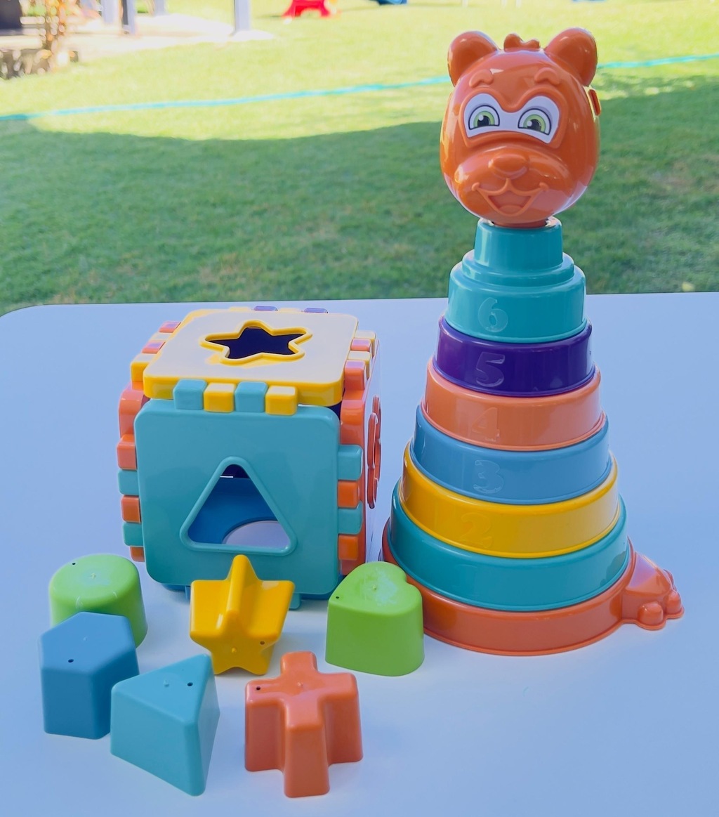 Conheça nosso ursinho com 06 anéis coloridos para empilhar e um cubo cheio de surpresas, com 6 formas geométricas diferentes!